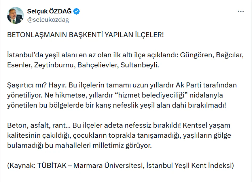 “İstanbul’da yeşil alan oranı en düşük olan ilk 6 ilçe açıklandı. Güngören, Bağcılar, Esenler, Zeytinburnu, Bahçelievler ve Sultanbeyli… Bu ilçelerin tamamı uzun yıllardır Ak Parti tarafından yönetiliyor. Ne hikmetse, yıllardır ‘hizmet belediyeciliği’ nidalarıyla yönetilen bu bölgelerde bir karış nefeslik yeşil alan dahi bırakılmadı!”