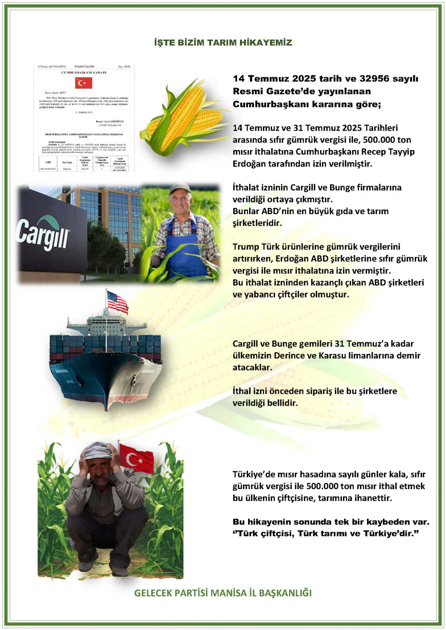 (MHA) - 14 Temmuz 2025 tarihli Resmi Gazete'de yayımlanan Cumhurbaşkanı Kararı ile 14-31 Temmuz tarihleri arasında sıfır gümrük vergisiyle 500 bin ton mısır ithalatına izin verilmesi, Gelecek Partisi Manisa İl Başkanı Yaşar Artar tarafından sert sözlerle eleştirildi. Kararın Türk çiftçisinin emeğini yok saydığını belirten Artar, "Bu bir tarım politikası değil, açıkça ihanettir" dedi.Artar, ithalat izninin ABD merkezli Cargill ve Bunge firmalarına verilmiş olmasına dikkat çekerek şunları söyledi:"ABD Başkanı Trump, Türk ürünlerine gümrük vergisi getirirken; bizim iktidarımız, Amerikan şirketlerine sıfır vergiyle ithalat izni veriyor. Böyle bir anlayışla Türk çiftçisi nasıl ayakta kalabilir?"Açıklamada, 2025 yılı mısır sezonunda %12'lik artışla 7,9 milyon tonluk bir rekolte beklendiğine de dikkat çekildi. İl Başkanı Artar, tam da hasat öncesi yapılan bu ithalatın, üreticinin emeğini baltalayacağını savundu."15 gün içinde 500 bin ton mısırın sipariş edilip limanlara gelmesi mümkün değil. Bu kararın önceden planlandığı ve belirli şirketlere özel olarak verildiği çok açıktır."İthalatın Türkiye'nin Derince ve Karasu limanları üzerinden gerçekleşeceği belirtilirken, Gelecek Partisi Manisa İl Başkanlığı açıklamasını şu cümleyle sonlandırdı:"Bu hikâyenin sonunda tek bir kaybeden var: Türk çiftçisi, Türk tarımı ve Türkiye."